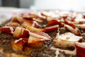Doce de leite, chocolate preto, creme de leite, morangos fatiados....